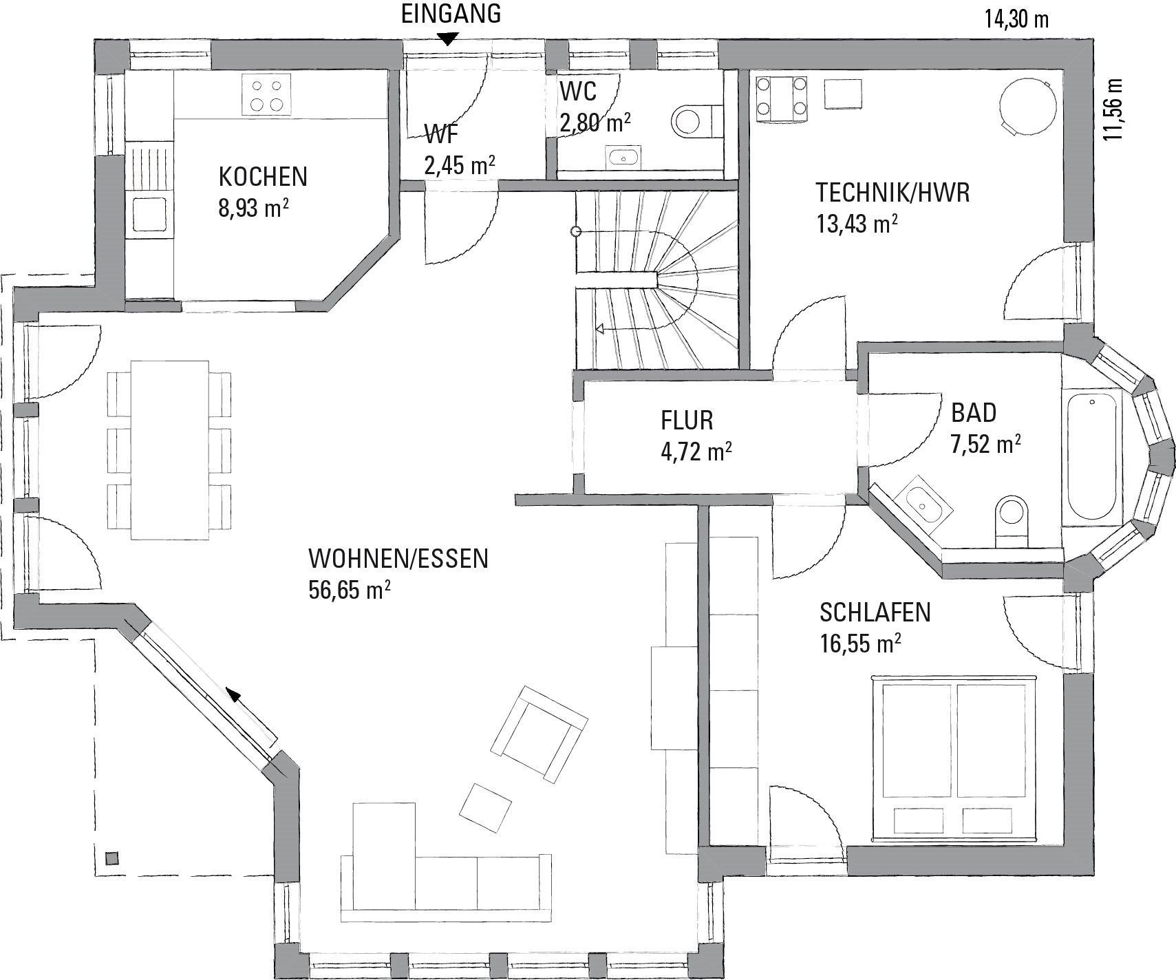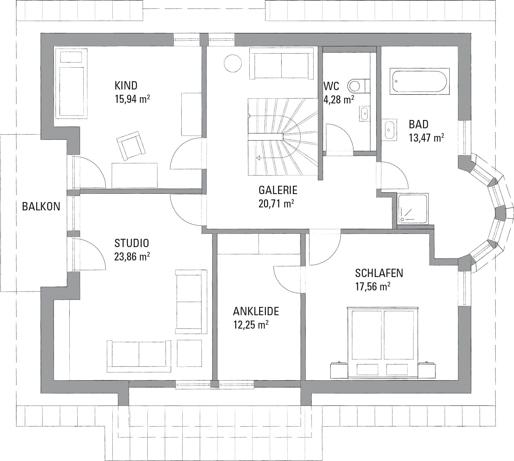 Klassisch und doch modern geht es im Musterhaus Mannheim zu. Im Außenbereich wurde bei der Fassadengestaltung auf klassische Elemente wie das Satteldach, den Rechteck – und den Segmentbogenerker und die Gaube zurückgegriffen. Das macht Sinn, denn so wird möglichst viel Sonnenlicht eingefangen. Innen gewinnt man damit Raum und eine gemütliche Atmosphäre macht sich breit.