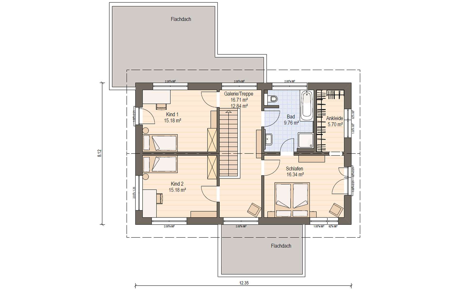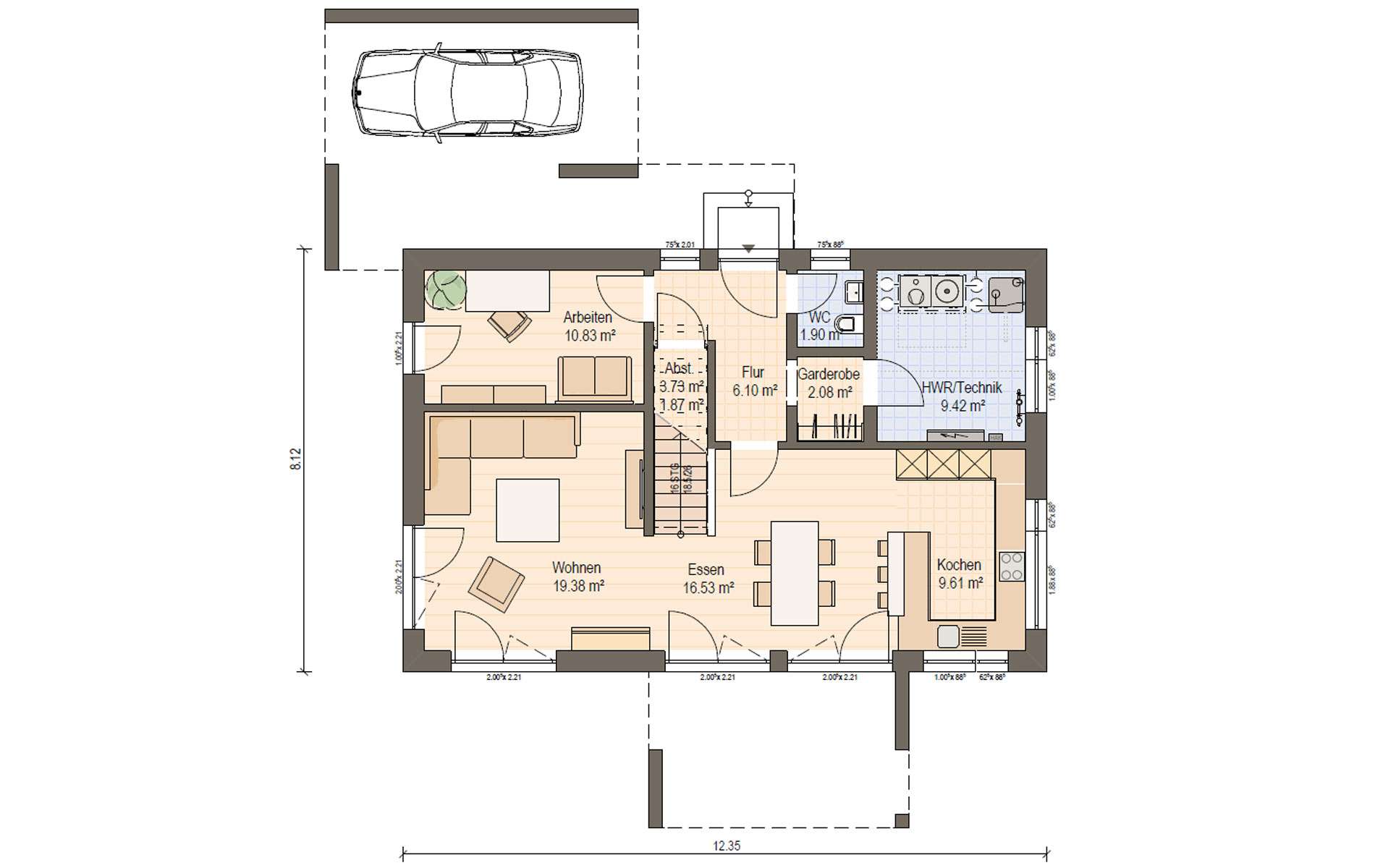 Innen überzeugt das Fertighaus mit einer offenen Wohnraumgestaltung, die klare Struktur besitzt. So bilden die Küche mit Küchenblock und der Essbereich eine lichtdurchflutete Einheit. Direkt angrenzend ist die Wohnlandschaft, die durch die geradlinige Treppe raffiniert vom Esszimmer abgetrennt wird. Auch ein Büro, ein Gäste-WC und der Technikraum finden im Erdgeschoss Platz. Im Obergeschoss befinden sich zwei gleich große Kinderzimmer, das Elternschlafzimmer mit eigener Ankleide und ein Familienbad.