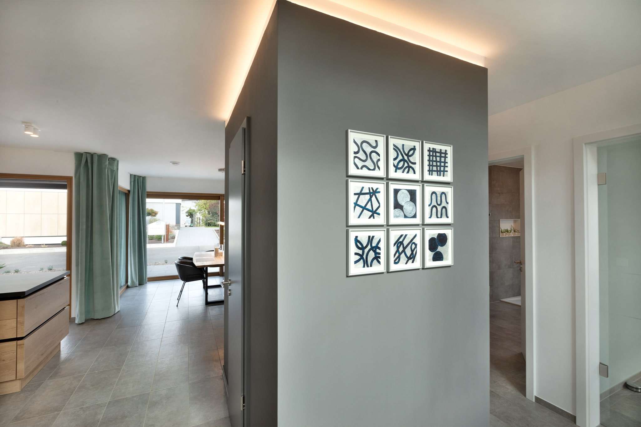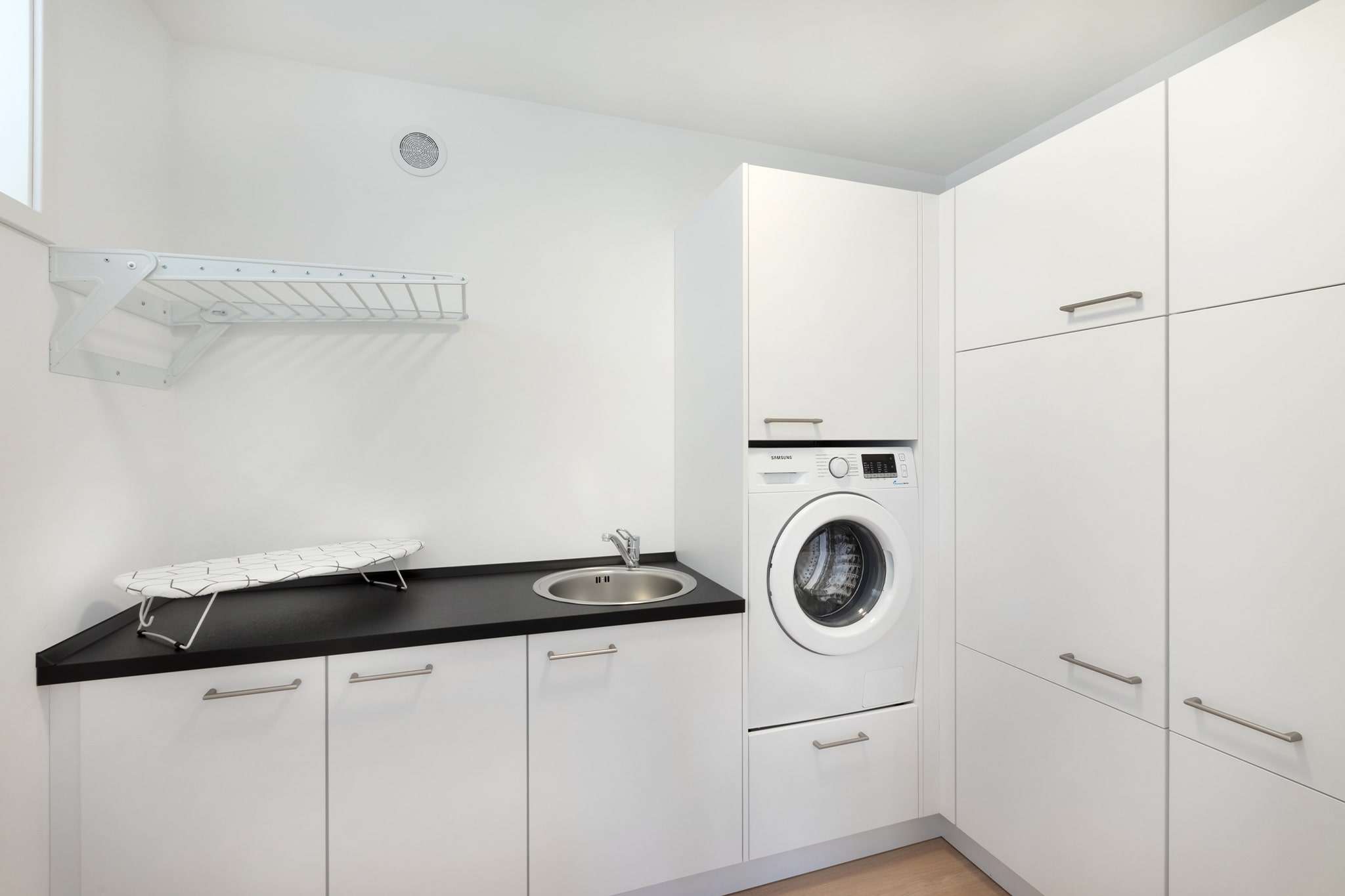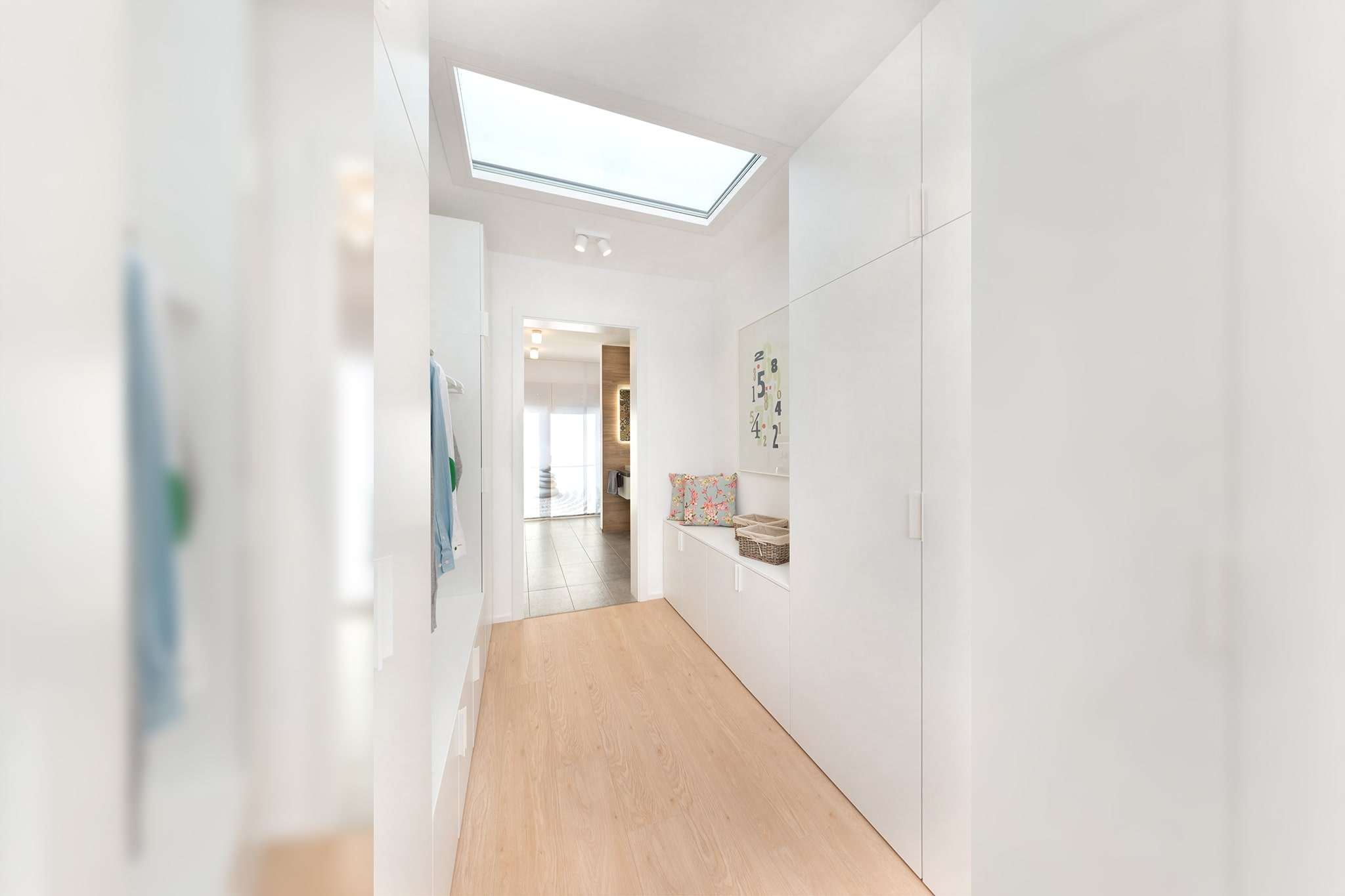 Auch der Hauswirtschaftsraum wurde bei diesem Musterhaus im Obergeschoss geplant. So kann die anfallende Wäsche direkt gewaschen und wieder in die Kleiderschränke verräumt werden.