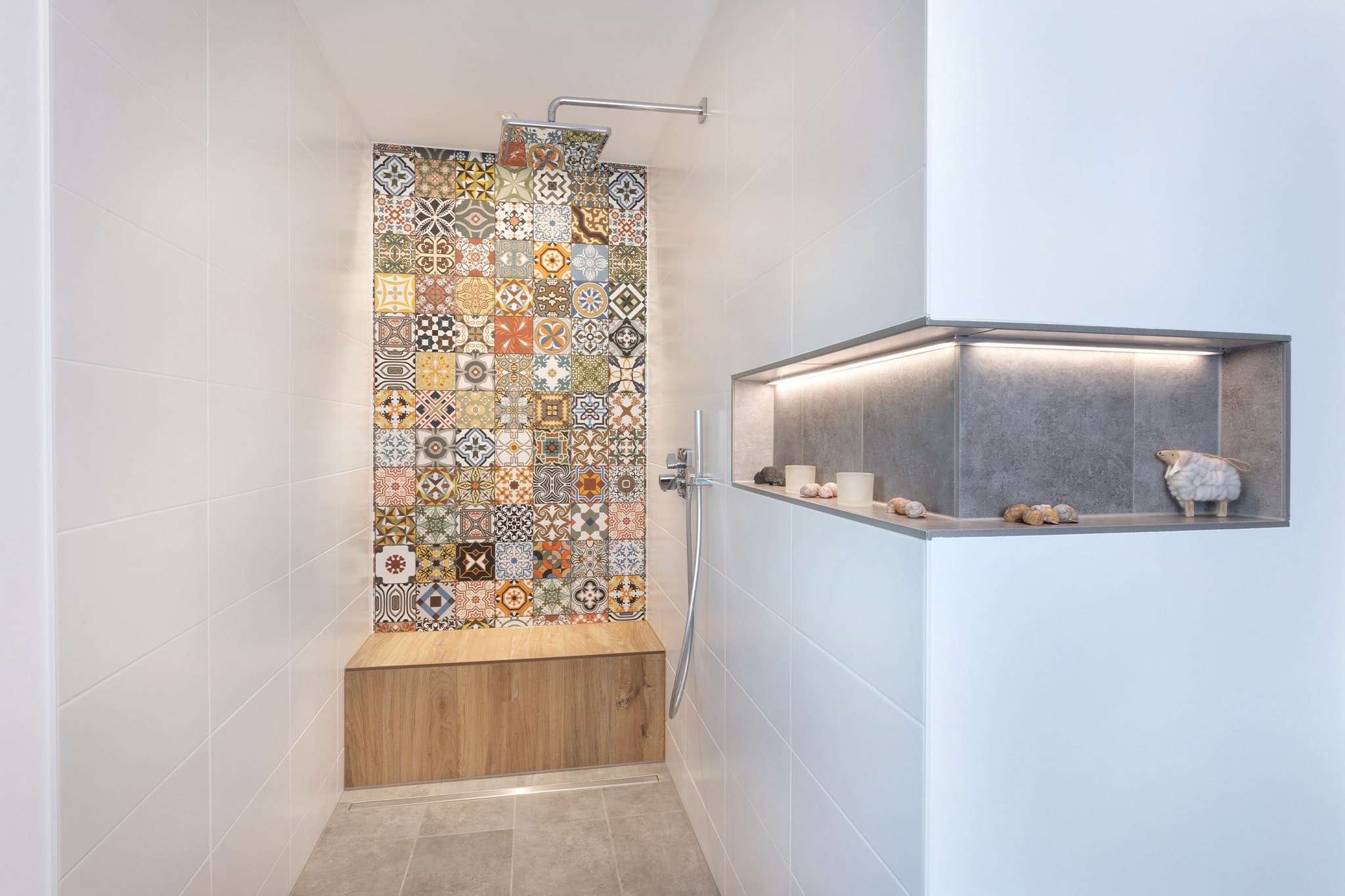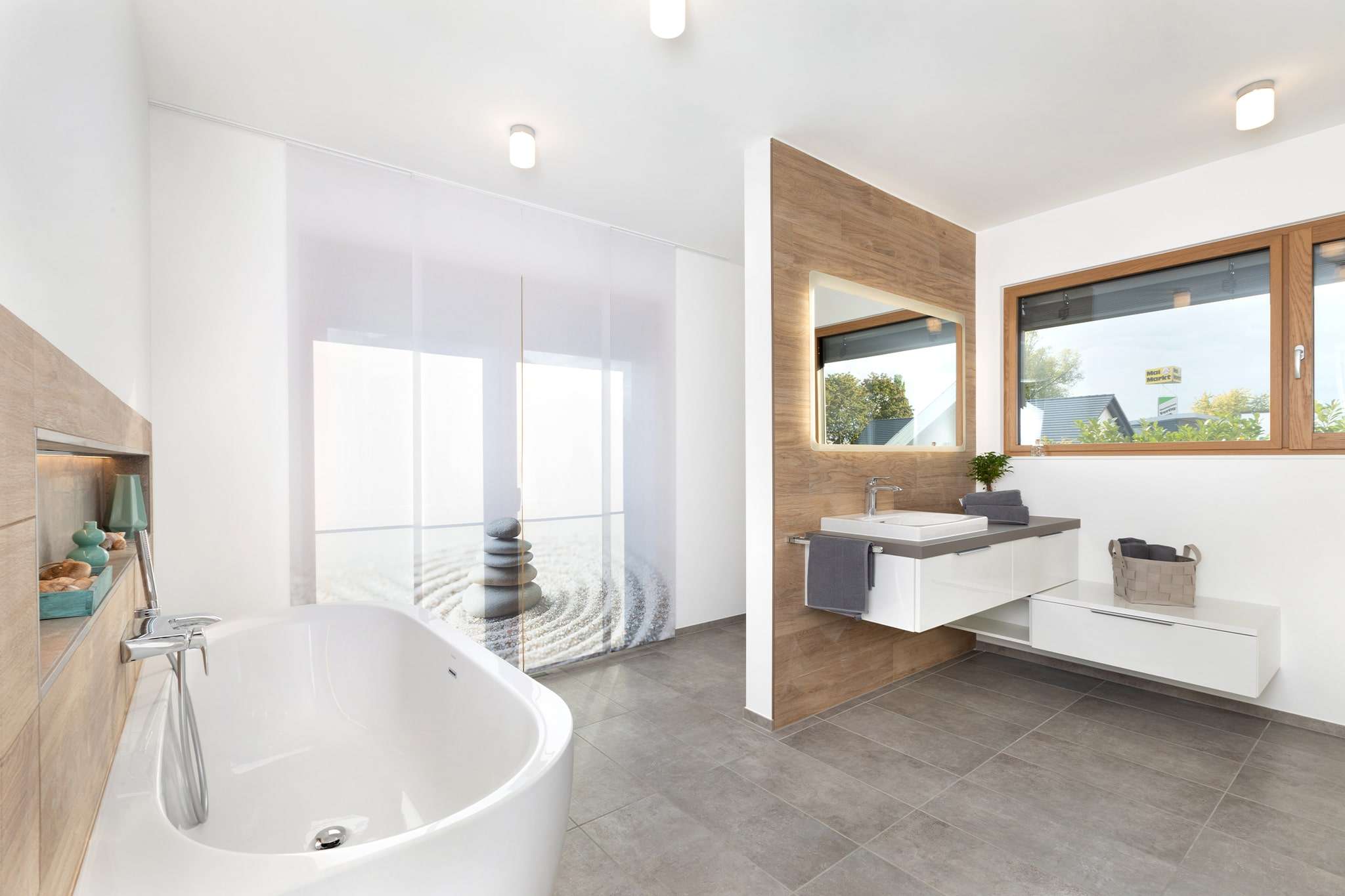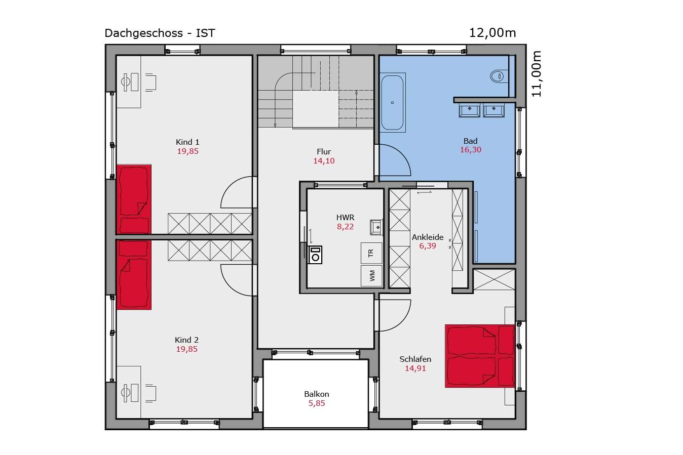 Die Schlafräume befinden sich im Obergeschoss und sind über eine dreiläufige Treppe mit zwei Podesten erreichbar. Zwei gleichgroße Kinderzimmer mit knapp 20 qm bieten jedem Kind ausreichend Platz. Das Elternschlafzimmer verfügt über ein direkt angrenzendes Ankleidezimmer. Eine Schiebetür grenzt die Ankleide vom Badezimmer ab. Neben einer großen begehbaren, bodenebenen Dusche wird das Familienbadezimmer mit einer Badewanne, zwei Waschbecken sowie einem WC ausgestattet. Die Toilette versteckt sich hierbei hinter einer Trennwand.