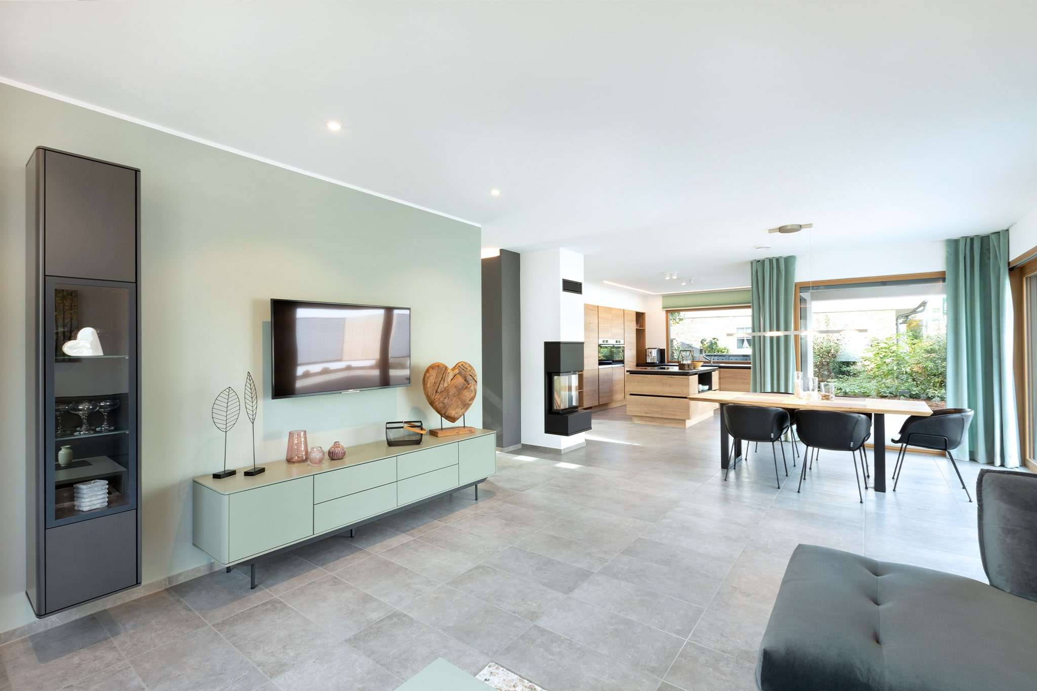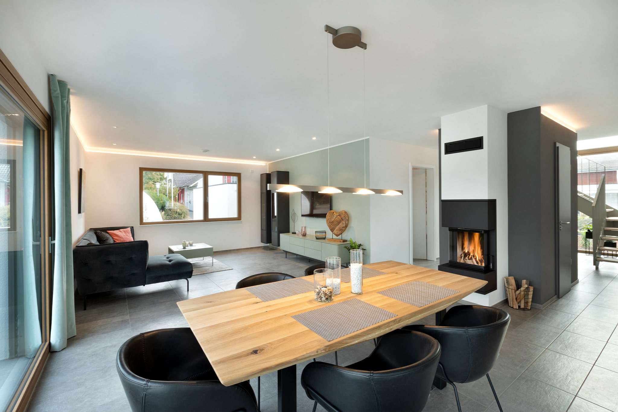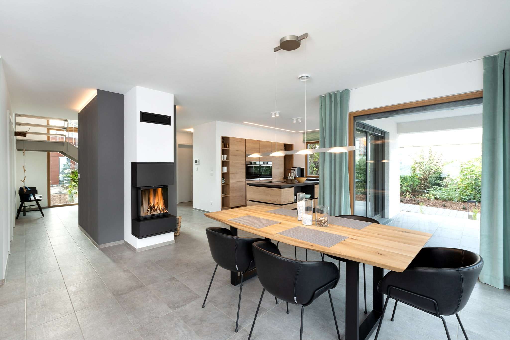 Der offene Wohnbereich mit über 50 qm Wohnfläche hat einen echten Hingucker: ein Kaminofen. Ergänzt wird das Erdgeschoss, um ein Dusch-Badezimmer sowie ein Büro, welches auch als Gästezimmer genutzt werden kann.