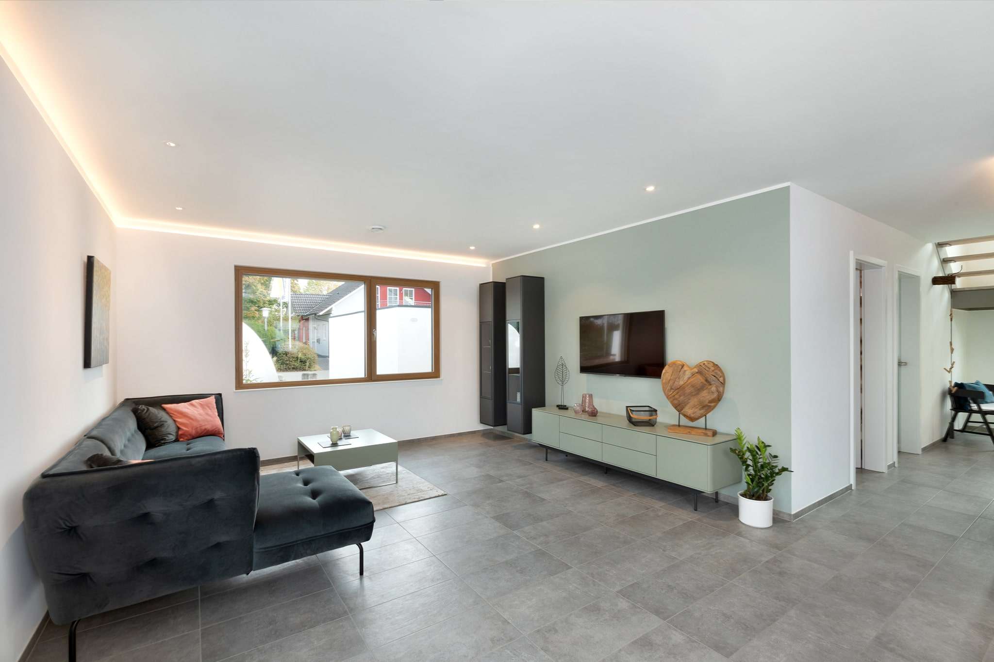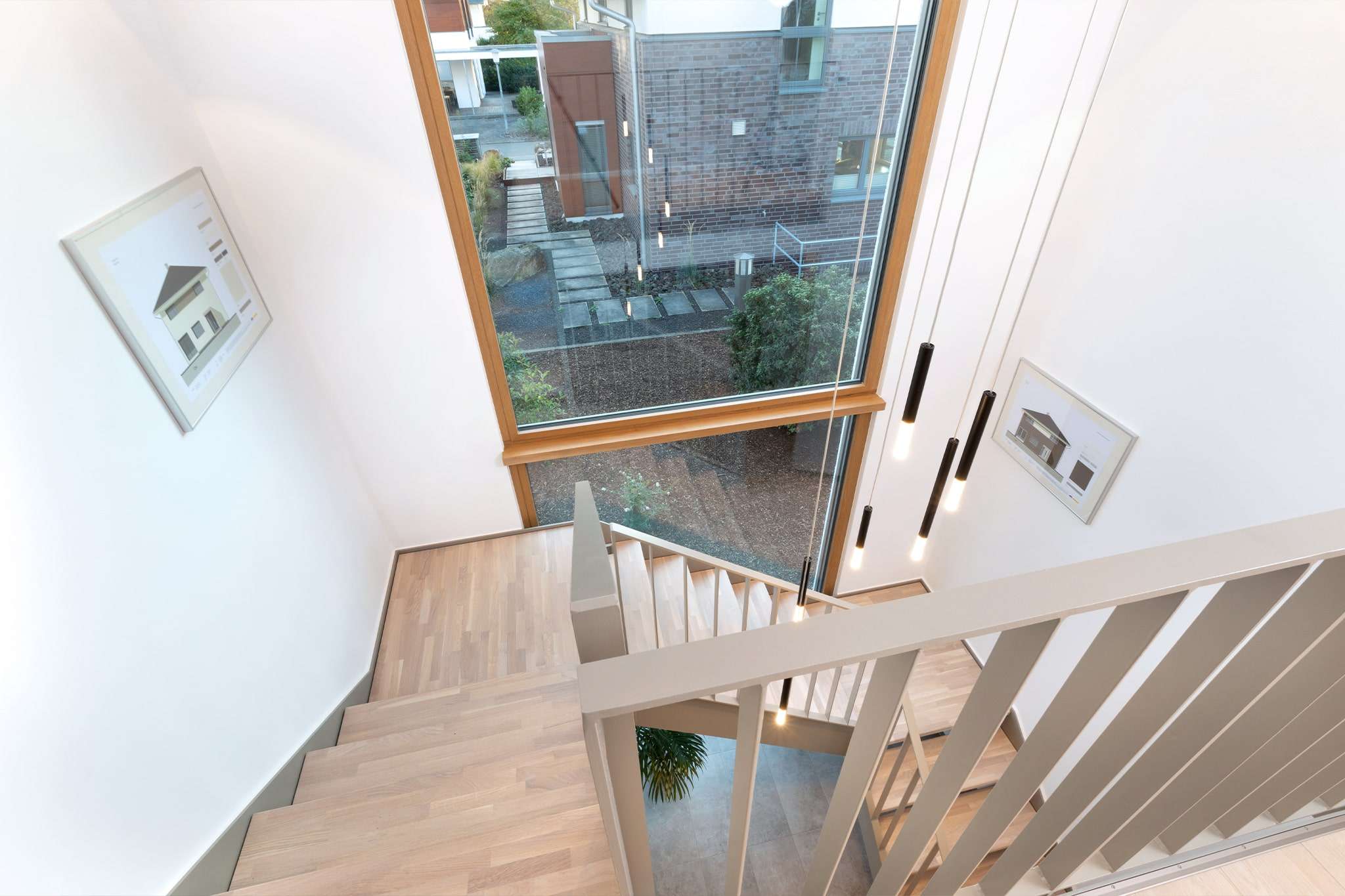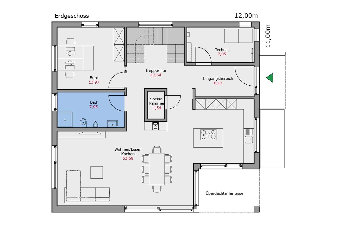 Die moderne Stadtvilla hat ein Außenmaß von 11 x 12 m und ist somit vom Grundriss nahezu quadratisch.