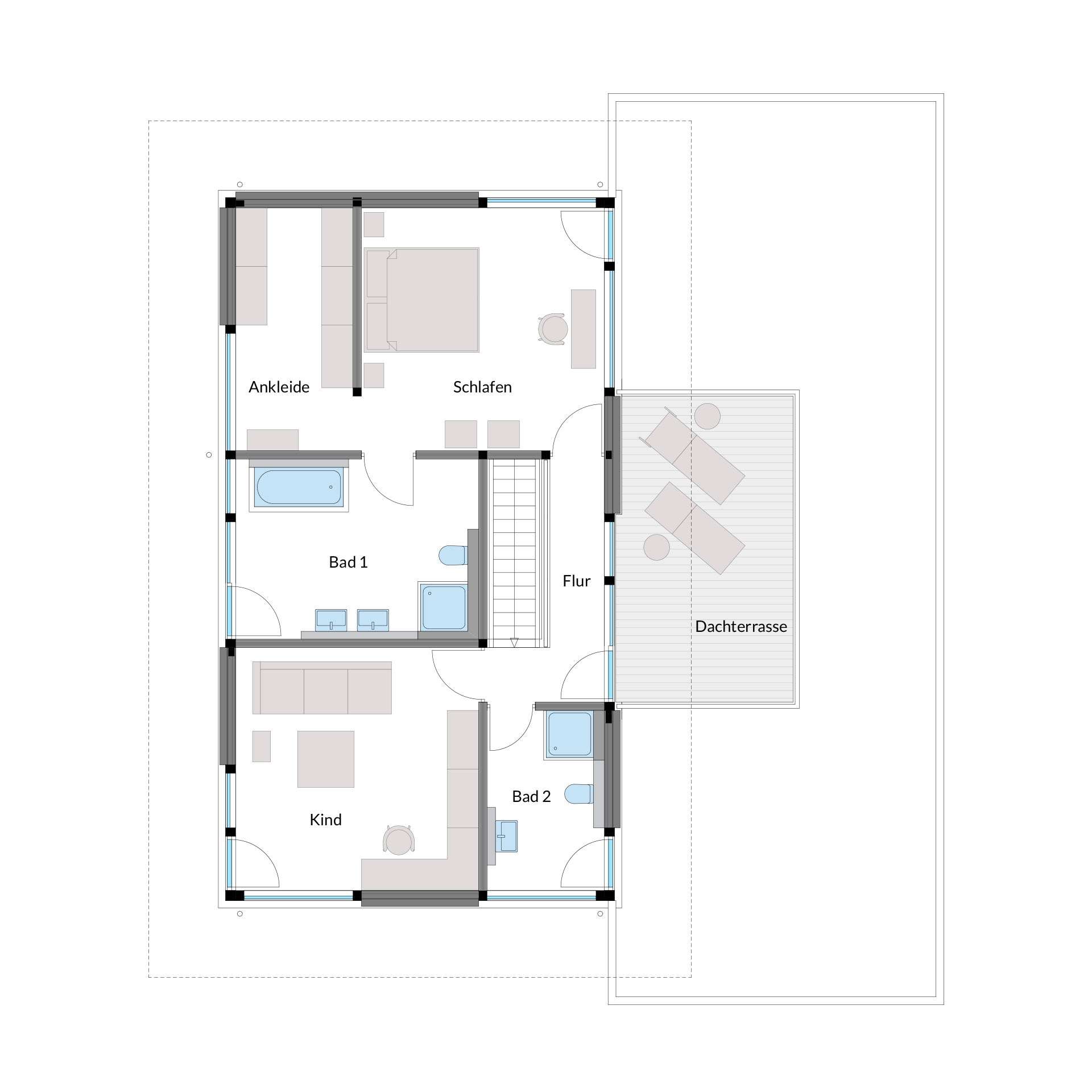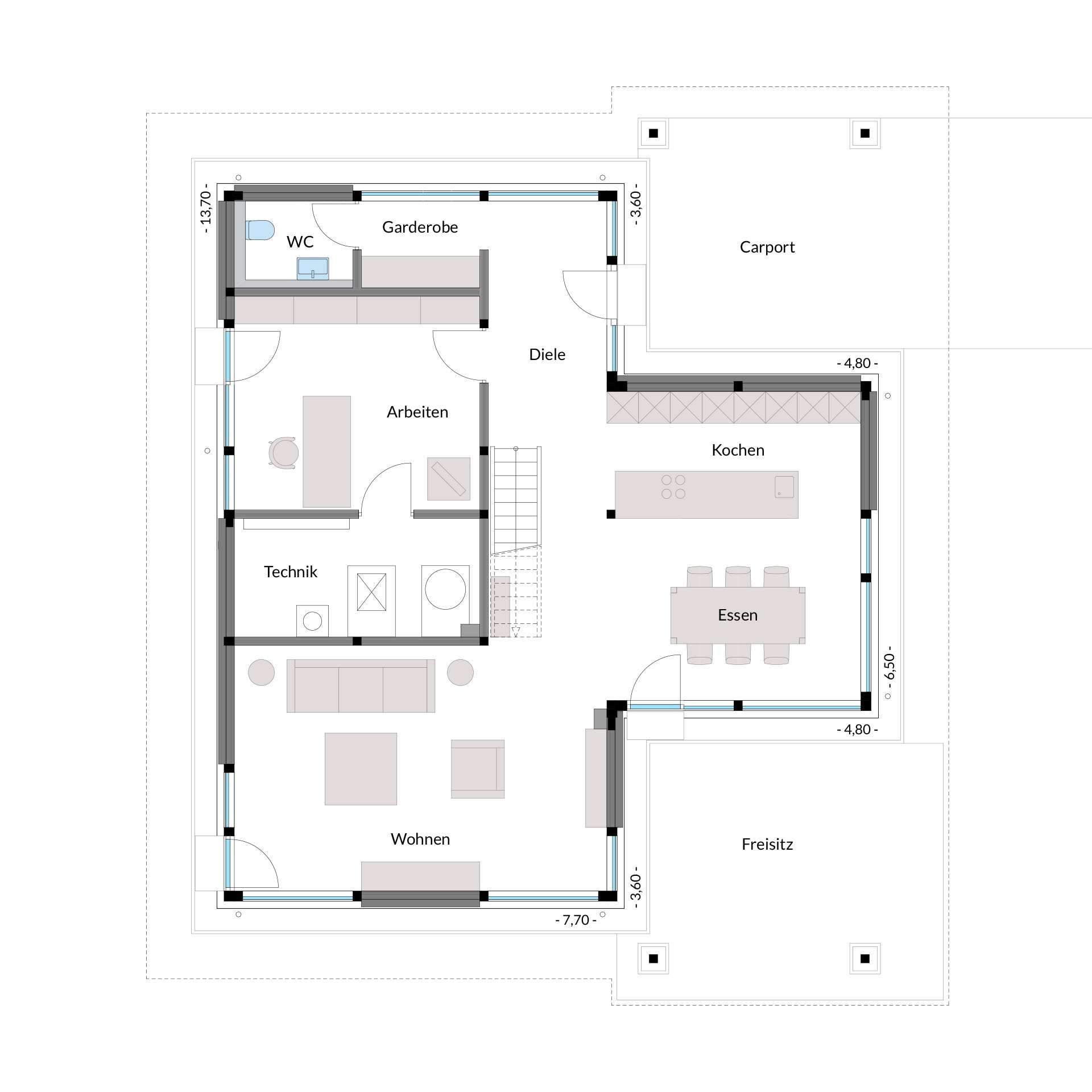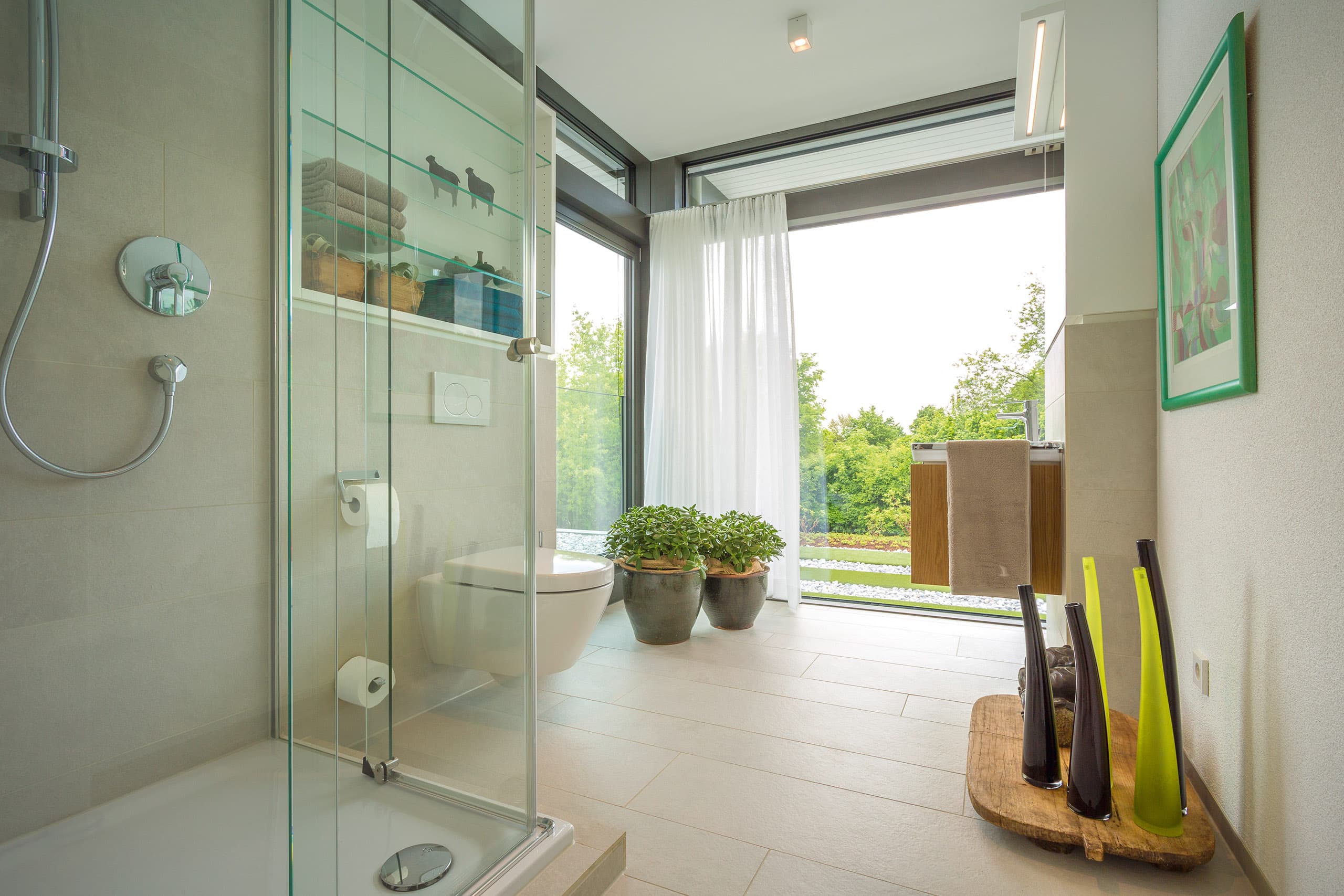 Das grüne Wohnkonzept entfaltet seine Wirkung bereits nach Öffnen der Eingangstür, denn entlang der Längsachse des Hauses kann der Blick durch den Eingangsbereich über den Essplatz hinweg in die Natur gleiten. Der überdachte Freisitz in Außenbereich bildet durch die bodentiefen Verglasungen und die große Schiebetür eine optische Verlängerung zu der eleganten Küche, die aus der firmeneigenen Möbelmanufaktur StilART stammt.
