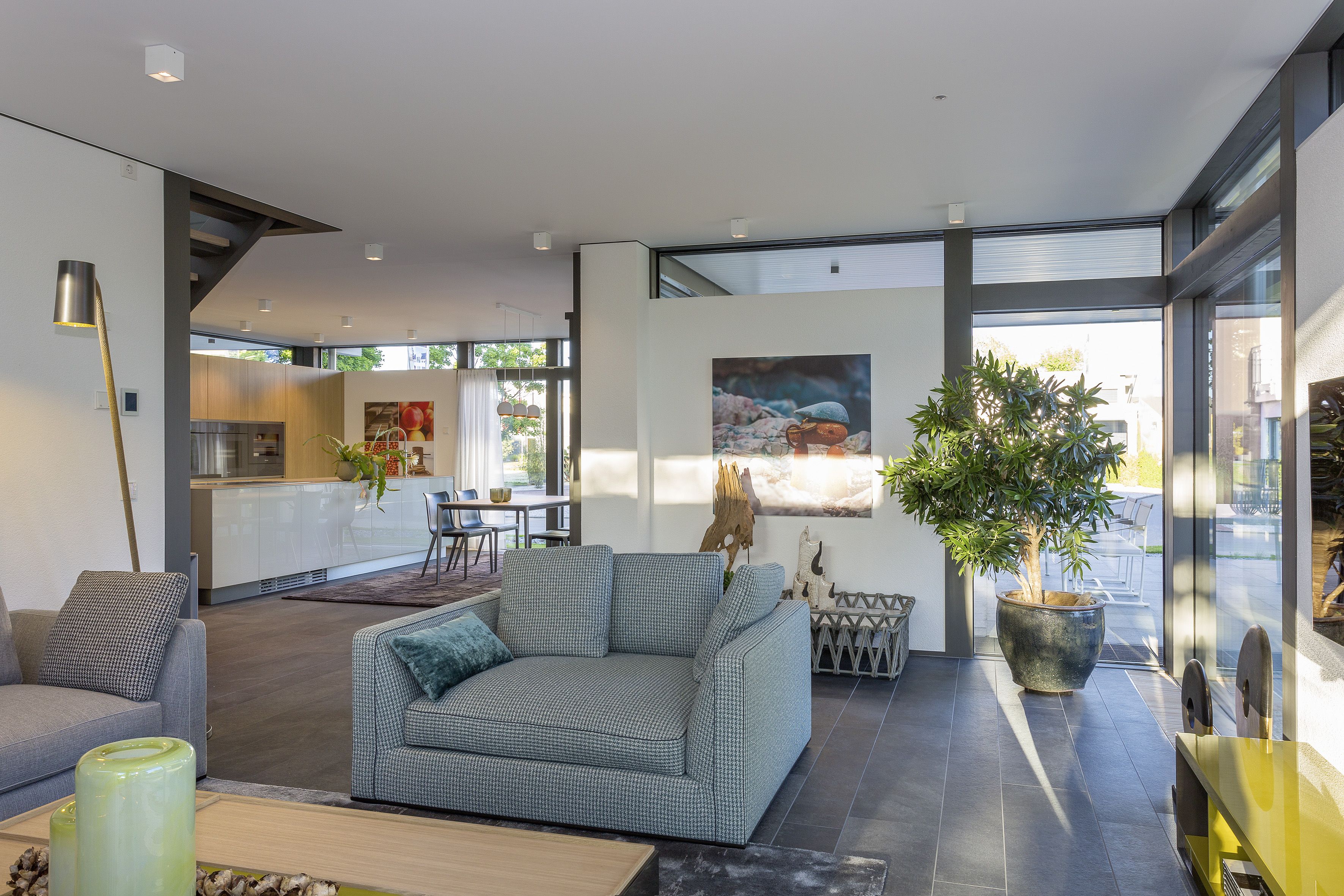 Mit viel Liebe zum Detail wurde auch die Inneneinrichtung des Musterhauses entworfen, die sich ganz dem Thema „Grün“ widmet. Die Farbakzente sind so gewählt, dass sich die Farben der Natur im Haus widerspiegeln. Dabei finden die grünen Akzente nicht nur in den Sitz- und Einrichtungsgegenständen, sondern auch in der Kunst ihren Platz.
