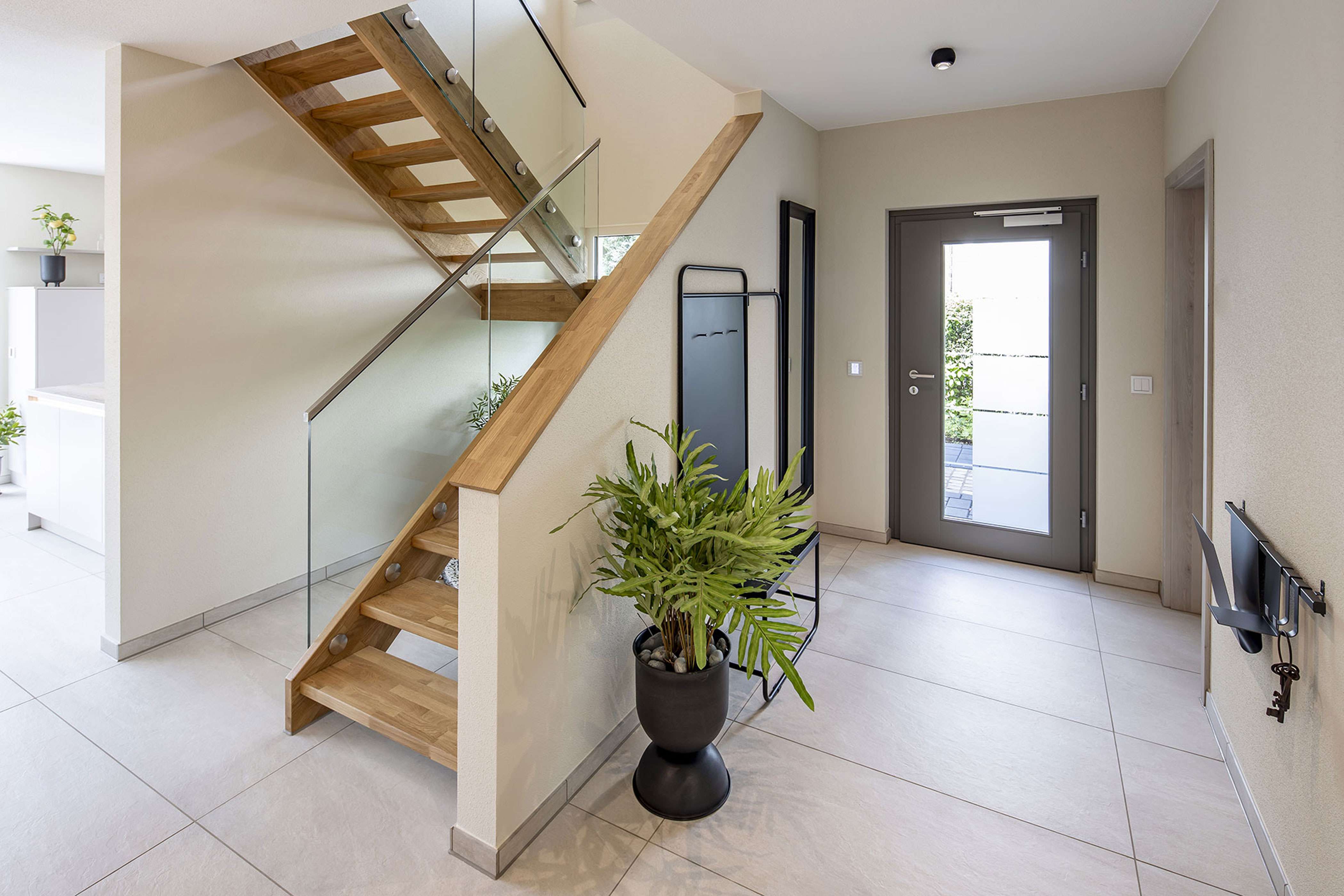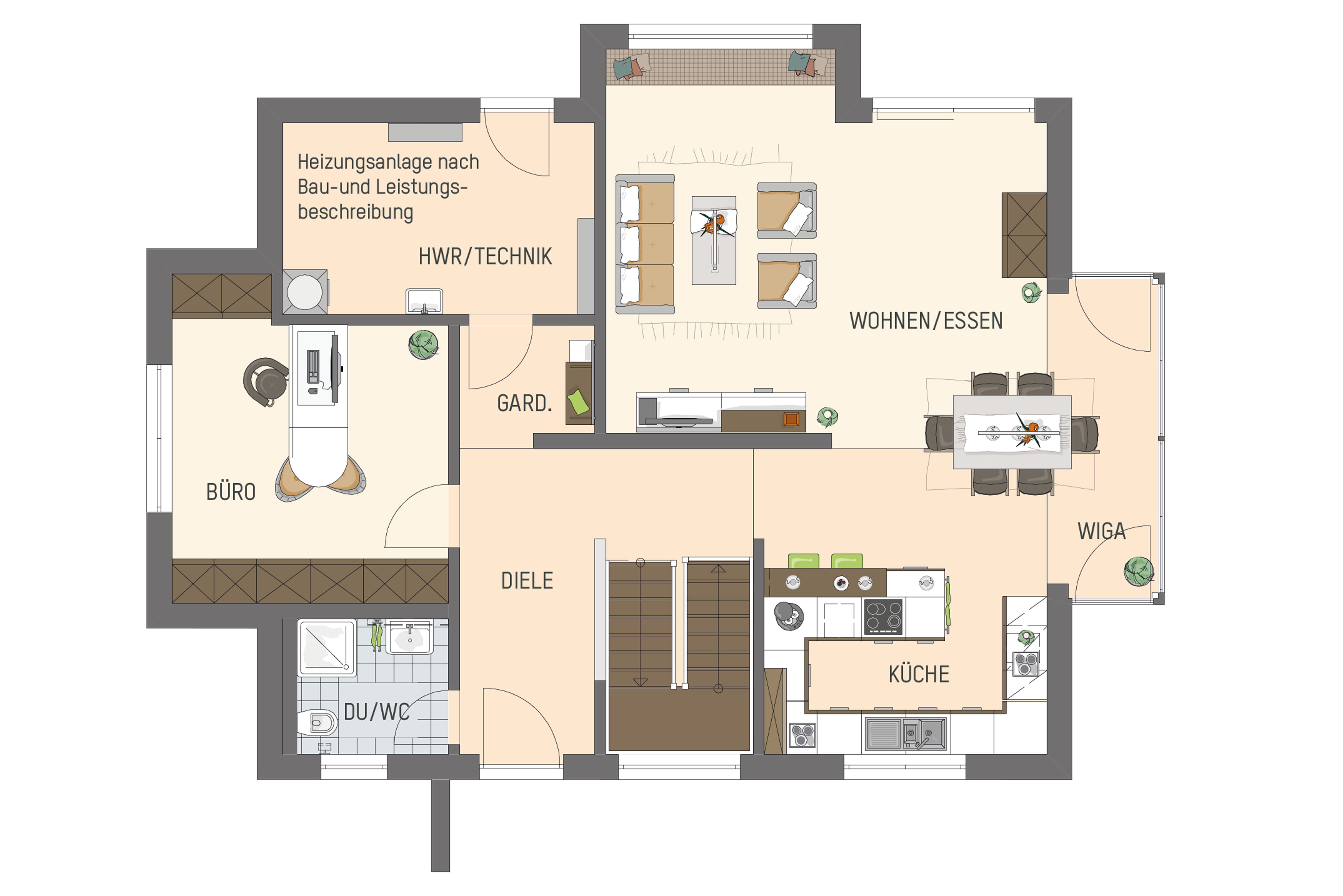 Der Grundriss im Erdgeschoss ist klar gegliedert: Vom Hauseingang betreten die Besucher eine großzügig bemessene Diele (16,37 Quadratmeter), von der links ein kompaktes Duschbad (3,77 Quadratmeter) abgeht. Praktisch ist die offene, aber optisch abgetrennte Garderobe. Dahinter gelangt man in den Hauswirtschaftsraum, der neben der Haustechnik auch genügend Platz für Waschmaschine, Trockner und Co. bietet. Für viele Baufamilien wird der Extraraum im Erdgeschoss besonders wichtig sein: Er kann als Homeoffice genutzt werden und bietet ausreichend Platz als Gästezimmer. Das Duschbad liegt gegenüber dem Gästezimmer.