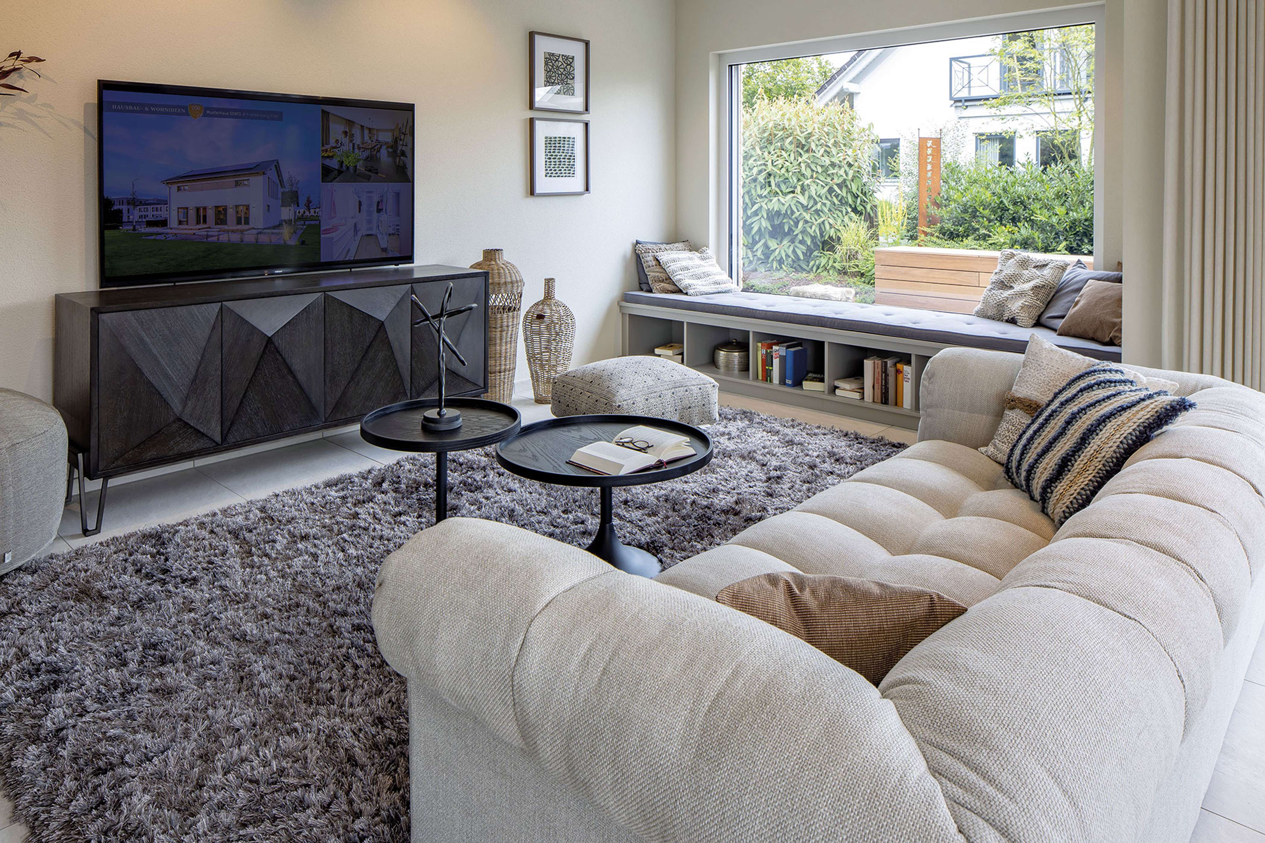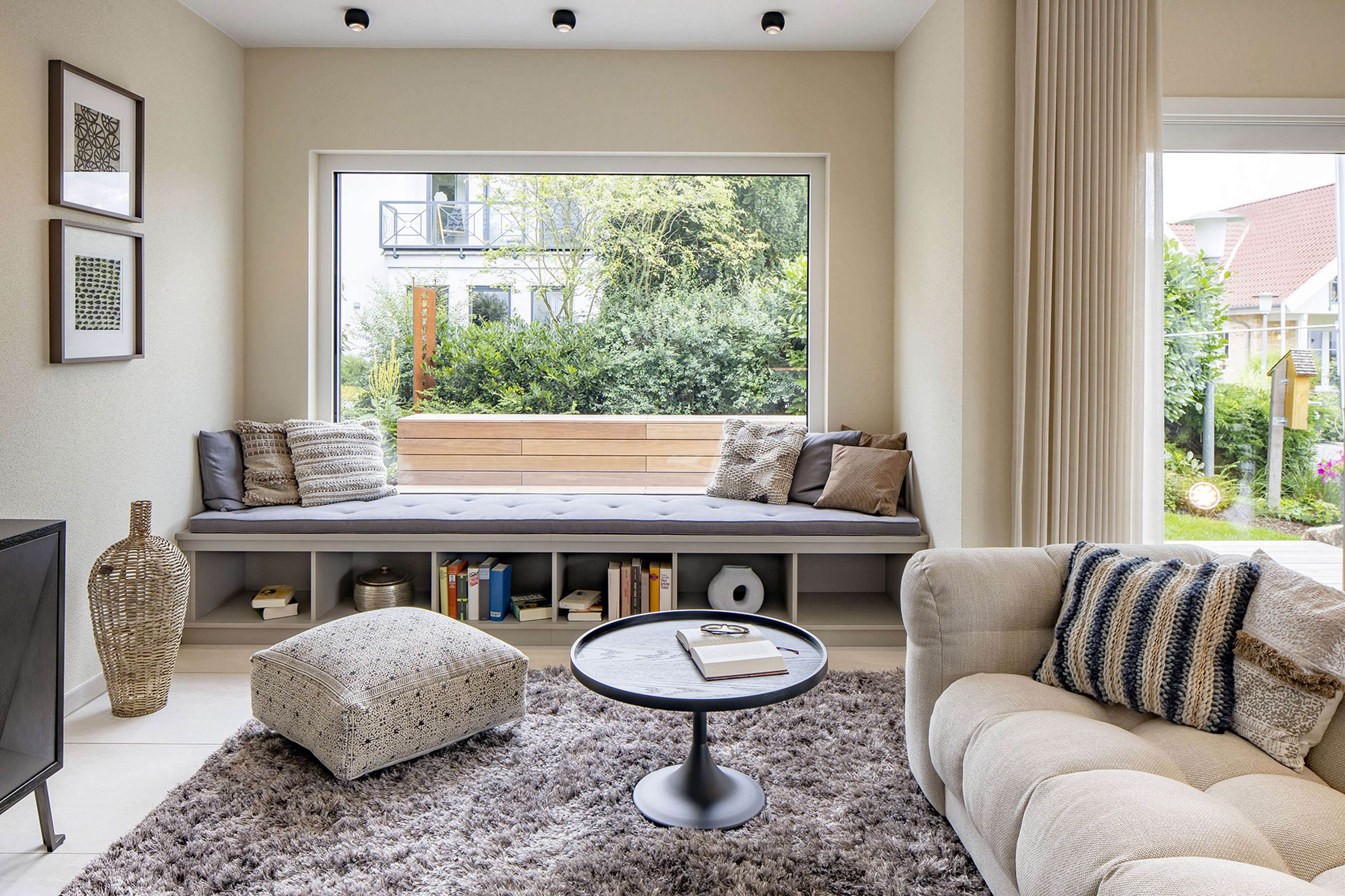 Von den insgesamt 179,18 Quadratmetern Wohnfläche (EG: 100,52 Quadratmeter, DG: 78,66 Quadratmeter nach DIN 277) entfallen allein knapp 50 Quadratmeter auf den verbundenen Wohn-/Ess- und Kochbereich sowie den Wintergarten. Das große Fenster im Erker ist mit einer herrlich gemütlichen Sitzbank ausgestattet, die zum Lesen einlädt und einen schönen Blick auf den Garten gewährt.